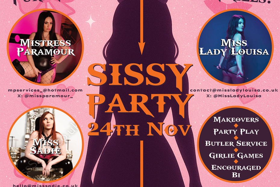 What another sizzler of a sissy party we have in store for you on the 24th November, a triple domme of treats and filthy frills of delight! Our sissy party is hosted by my wonderful self, the beautiful Mistress Paramour and the wickedly delicious Miss Sadie.